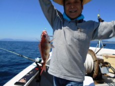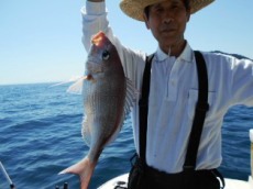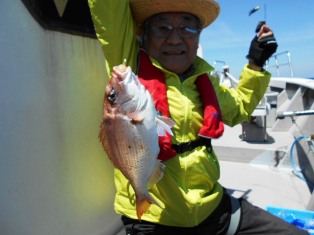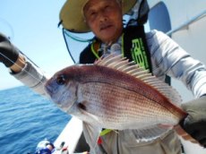 船長は太仕掛けということで、自作のハリス7号12m2本針の仕掛けで釣り始めます。今日の潮は緩そうです。シモリ浮きを付けます。ゆっくり流していくと80m程で走ります。糸ふけを取って合わせを入れ、巻き上げます。順調良く40cmの真鯛をゲットです。