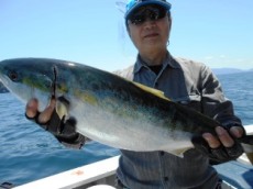 続いて流していると今度は46mで走ります。強烈な引きです。何と、(小)ブリをゲットです。