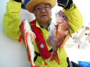 天秤フカセと胴付きで頑張りました。富田会長の指導の下胴付きで小鯛、小ぶりを釣ることができました。ありがとうございます。