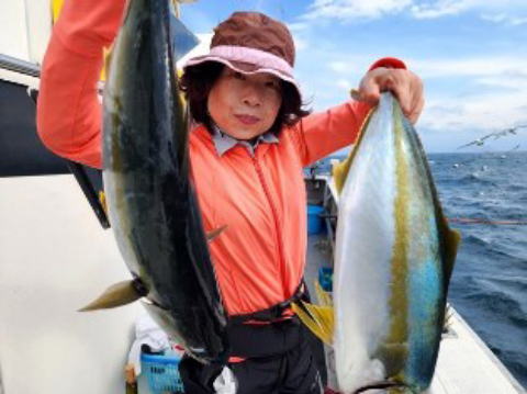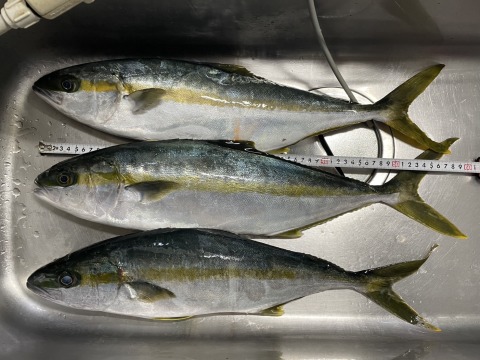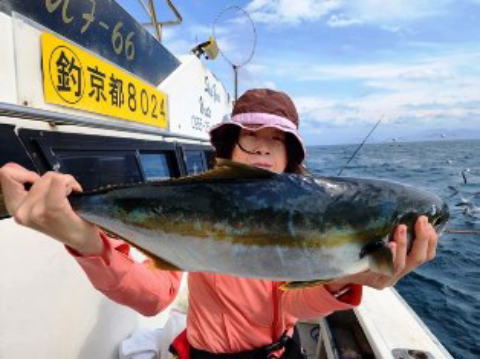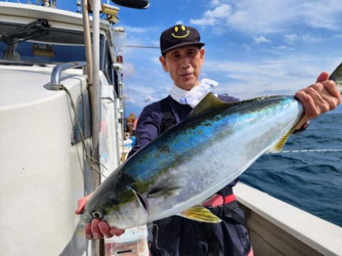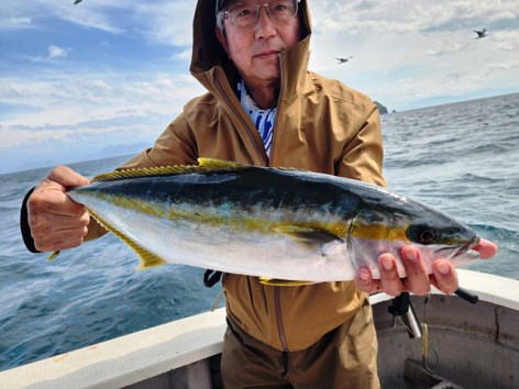 小生も準備を済ませ、さあ投入というところで隣の澤田さんがトラブルです。バックラッシュに苦戦しています。バックラッシュを解いている間にも艫で釣りをしている田所さん、順調に釣りあげています。なかなか焦りますね。ようやくトラブルを解消、さあ投入です。すると50m程流していると突然に道糸が走ります。クラッチを入れて電動リールを巻き上げます。上がってきたのは78cmのメジロです(あと2cm長かったらブリでした)。
