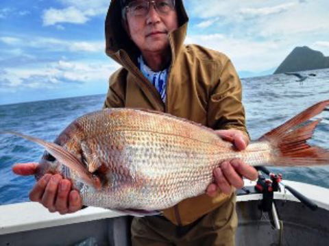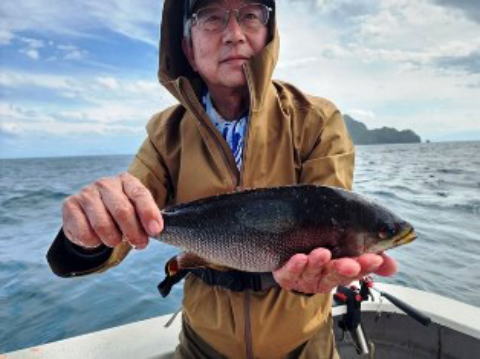 出港して外海に出ても、大波やうねりは無かったが、北風がやや強い。当日のポイントは、冠島と沓島の間で、水深62mでスタートです。多少のポイント移動はあったが、ほぼ終日この辺り。 |