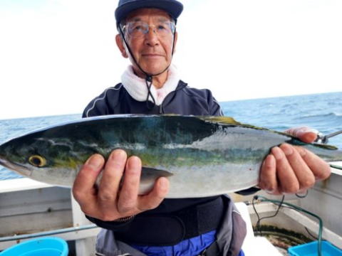 その後もイサキが釣れますが、強風のため釣りにくい状況が続きます。強風のせいかカモメが餌を取るため船の周辺から離れません。撒き餌を撒くとカモメがオキアミをついばみにきます。どうしても仕掛けに絡みます。カモメの間を縫って仕掛けを流します。そうすると大きな当たりが。道糸がドンドン走ります。上がってきたのは待望のヒラマサです。クーラーボックスが小さいため、尾を切ってクーラーボックスにおさめます。