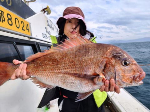そうしているうちにまた当たりです。隣で見ていると今までと竿の曲がり方が違います。魚が竿を叩いています。慎重に巻き上げ、上がってきたのは73cmのきれいな乗っ込みマダイ(メス)です。