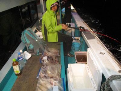 集魚灯が点いて暫くすると船長から40~60mの間で反応が出たとのことで、最初は60m迄落として2~3m巻いてアタリを待ち、40m迄巻く動作を繰り返していたが、これでは両手が塞がって飲み食いが出来ない。そこで40m迄落としてスプールを親指で押さえて止め、アタリが無ければ親指を離し2~3m落として止める操作を60m迄繰り返した。こうすれば片手が空くので、飲み食いしながら釣りも楽しめた。
