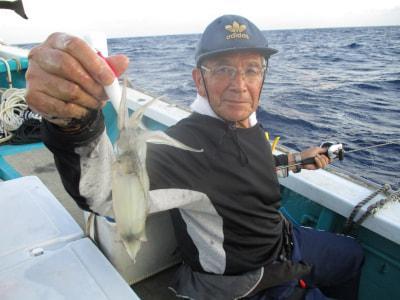 船長より水深百?mとのアナウンスがあり、え~100mは深過ぎると思いながら仕掛けを投入する。暫くして着底し少し巻き上げたら重い・・・ いきなり根掛かりかと思ったが巻けばドラグが滑りながら上がって来た。ドラグを締め直して頑張って手巻きで海面まで巻き上げると鉛スッテの方に大きなスルメイカが掛かっていた。坊主逃れ、達成!
