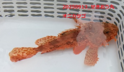 第1投目、撒き餌は効いていないにも拘わらず早速当たりです。大きな引きはなく、順調に上がってきます。30cmくらいのオニカサゴです。狙い通り下針に掛かっています。作戦成功です。