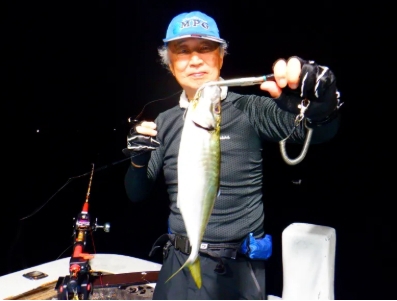 澤田さん、今日は得意の胴突き釣りです。長さ9m5本バリの仕掛けで釣り始めます。風が強いので長い仕掛けの取扱いに苦労しますが持ち前の粘りでもくもくと釣っています。最初のポイントでは時たまマダイ、サバが釣れるだけですが、夜のポイントに移動してからはアジを爆釣です。良型(35㎝位?)のアジをダブル、トリプルで上げています。コップ片手にのんびりと釣りをしたいところですがそうもいかないようです。釣れないとコップを口に運べますがなかなかあんばいが難しいですね。まあ、釣れるのが一番です。