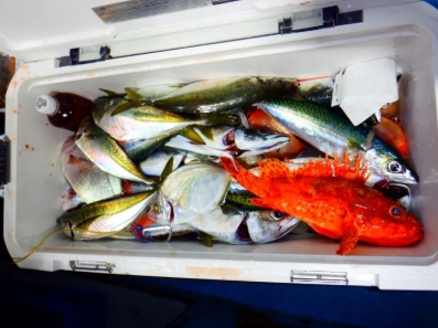 早速ヒットしマダイとご対面。その後も順調にタイや大型のアジに混じりサバ、ブリの幼魚も。