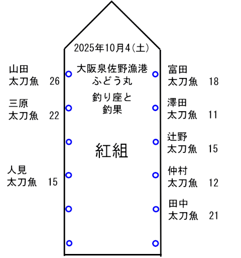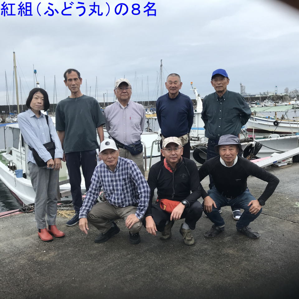 今年は参加者多数のため、釣船2艘に分かれて開催です。いつものふどう丸に8人、同じ泉佐野の漁幸丸に3人が乗り込みました。ふどう丸を紅組、漁幸丸を白組とし、紅白対抗で釣り合戦を行うことにしました。釣り上げた太刀魚の平均匹数で勝敗を決します。