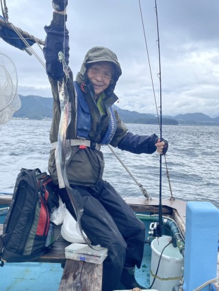 時々小雨、波は無し、釣り時間は潮どまりとその前後の釣り環境で漁幸丸の左舷艫から山本さん、田所さん、岡田の釣り座でスタート。右舷側の後ろの常連たちはでっかい声でしゃべりまくりやかましい。 左舷は静かの中、右舷側の数人に太刀魚が上がりバタバタ。今回は紅組との対抗とのこともあり、ずいぶんとYouTubeで釣り方を学んで臨んだことが功を奏したのか、永年太刀魚釣りしているが初のドラゴンもどきが2本続いて上がりどよめく。サポートの小坊主がボソボソト何か言いながら計測して、1本目は116cm、2本目は122cmドラゴンが出ました!とちょっと大きな声で。やったー!今回のリールは中古シーボーグ250FBの初仕事、見事に働いてくれてやれやれ。やはりライトゲームは小形の方が使い勝手が良い。なるほどうんうんとうなずきながら次から次と太刀魚が上がる。