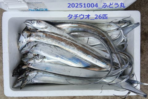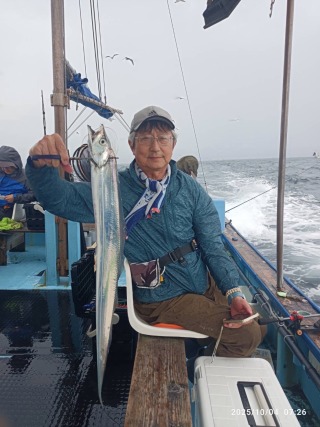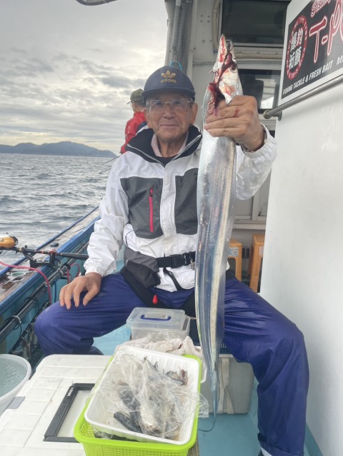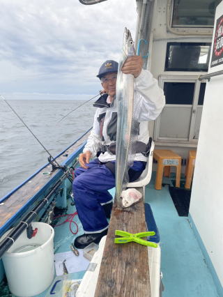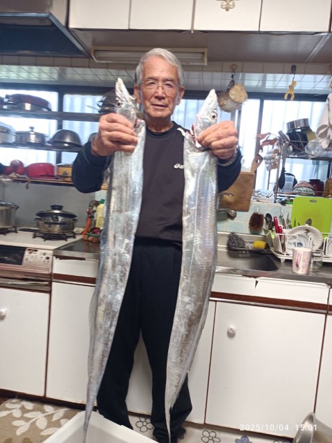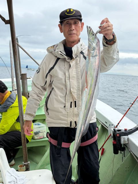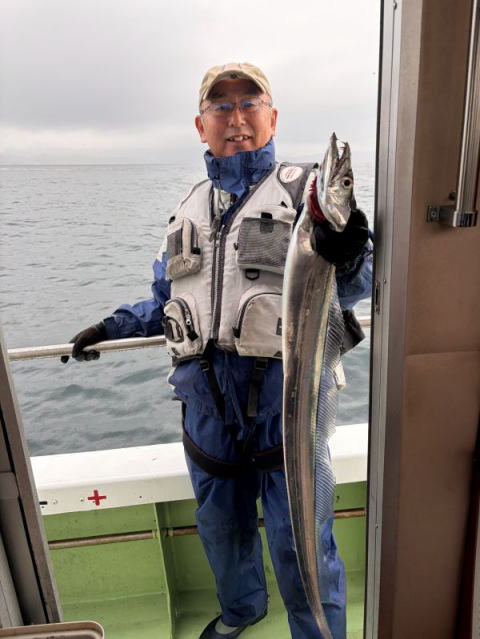 澤田さん、2年ぶりの太刀魚釣りです。張り切って参加します。ところが木曜、金曜と横浜出張だったようで今日は寝不足です。ふどう丸への道中、ふどう丸に乗り込んでからポイントへの移動中も熟睡です。ところがポイントに着いたとたんにお目々がパッチリ、第一投で早速太刀魚を釣り上げています。サイズはF3でしょうか、順調に釣り上げます。あっという間に5匹ゲットです。ところがところが、そこからは潮が悪いのか(二枚潮、三枚潮)、太刀魚テンヤをうまくコントロールできません。リーダーは切られる(多分太刀魚に)は高切れするはで悪戦苦闘です。そんな中でも何とかつ抜け達成です。