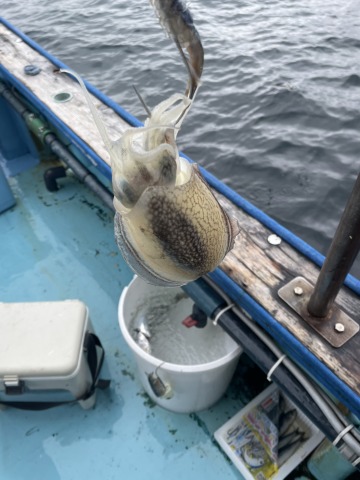 岡田さんがワンピッチジャーク?とか言いながら、バンバン釣り上げているのを見て真似をしてみたが釣れない。私は電動リールのスロー巻きで、なんとか追いかけている状態だが、それでも100cmのF5のメタボが1匹釣れた。その後、上げての合図で巻き上げると、何とコウイカがテンヤに掛かっていた。